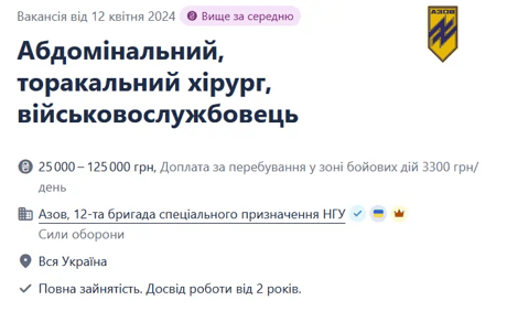Бригада спецназначения "Азов" ищет в свои батальоны и другие подразделения абдоминального, торакального хирурга. Специалисту обещают зарплату от 25 до 125 тысяч гривен.