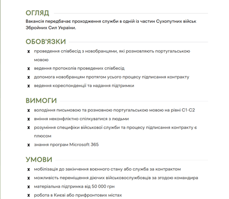 Сухопутні війська шукають для служби у війську рекрутера зі знанням португальської мови. Натомість обіцяють заробітну плату від 50 тисяч гривень.